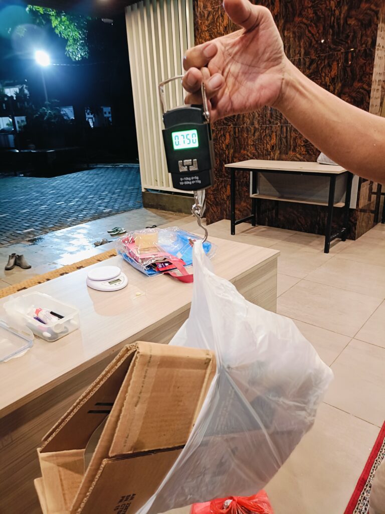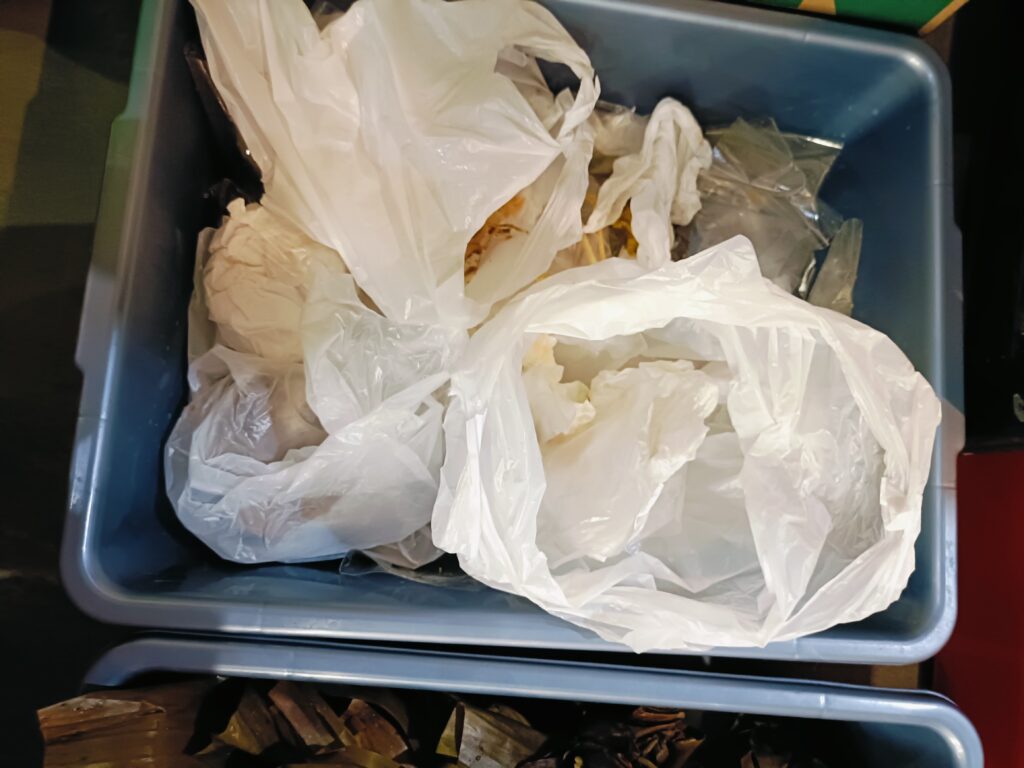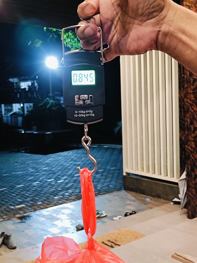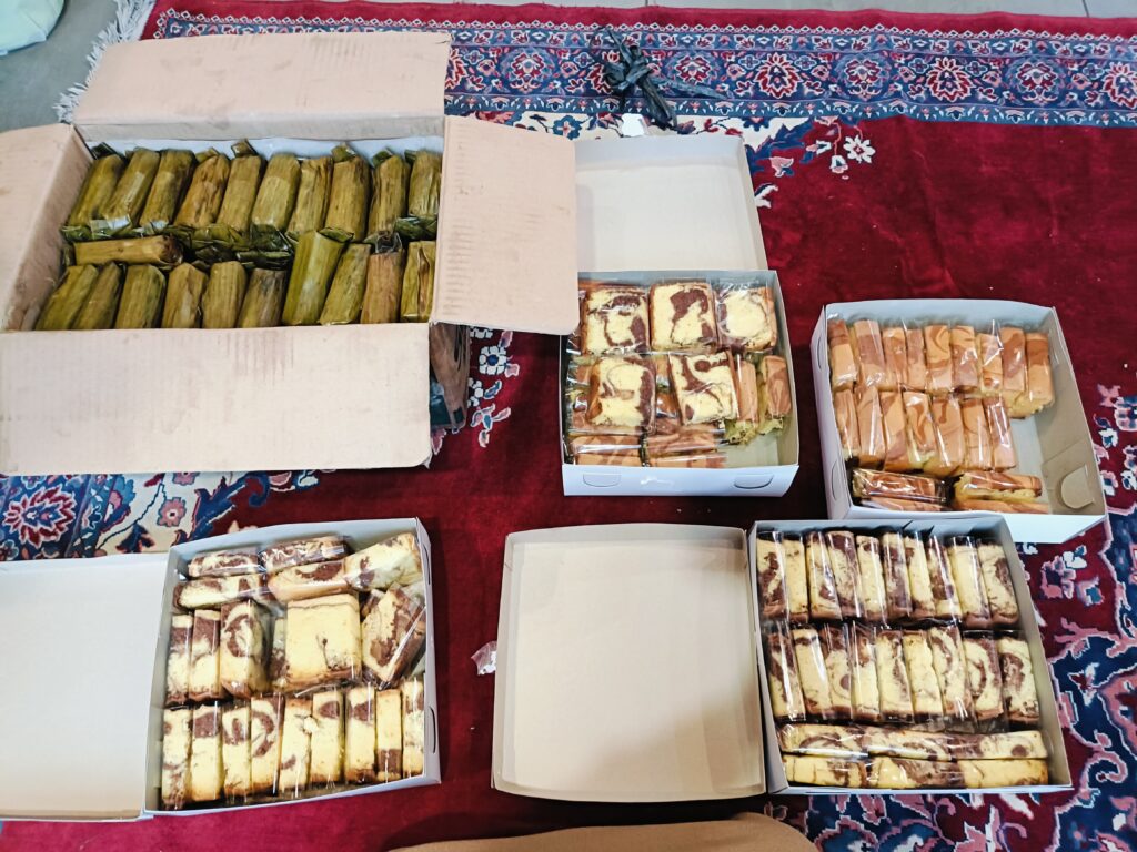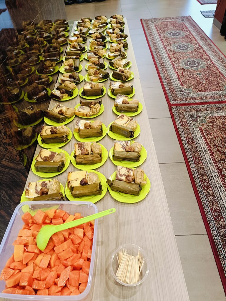 Timbulan sampah dari sisa makanan (organik), 0.260 kg, sampah residu dari daun pisang, plastik dan tisu, 0.845 kg, sampah daur ulang dari dus kue, kardus kurma, 0.750 kg.