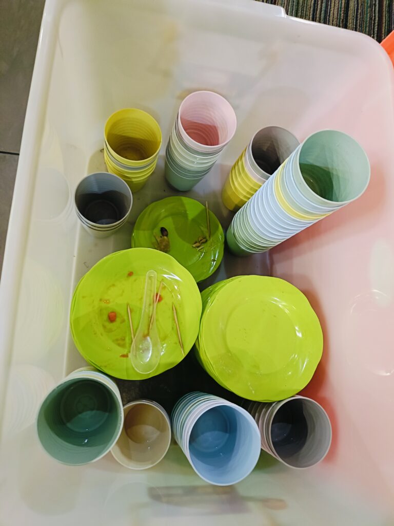 Gelas dan piring kecil guna ulang yang digunakan, untuk gelas sebanyak 85, piring kecil sebanyak 90.