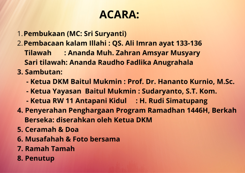Terima kasih atas partisipasi, kerja sama, dan keikhlasan semua pihak yang telah mendukung kegiatan selama Bulan Ramadhan 1446 H.