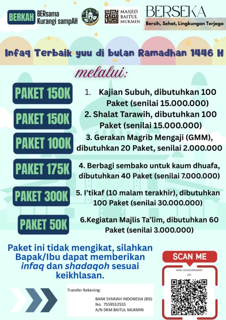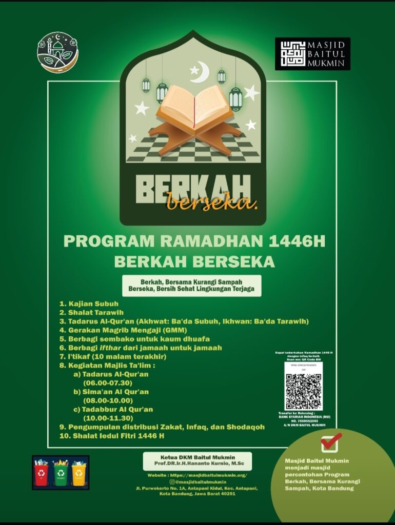 Ramadhan 1446 H tahun ini, Masjid Baitul Mukmin menjadi percontohan di Kota Bandung dalam Program Berkah, Bersama Kurangi Sampah, mengajak semua jamaah untuk bergerak bersama dalam Program Ramadhan 1446, Berkah Berseka, Bersih Sehat Lingkungan Terjaga,